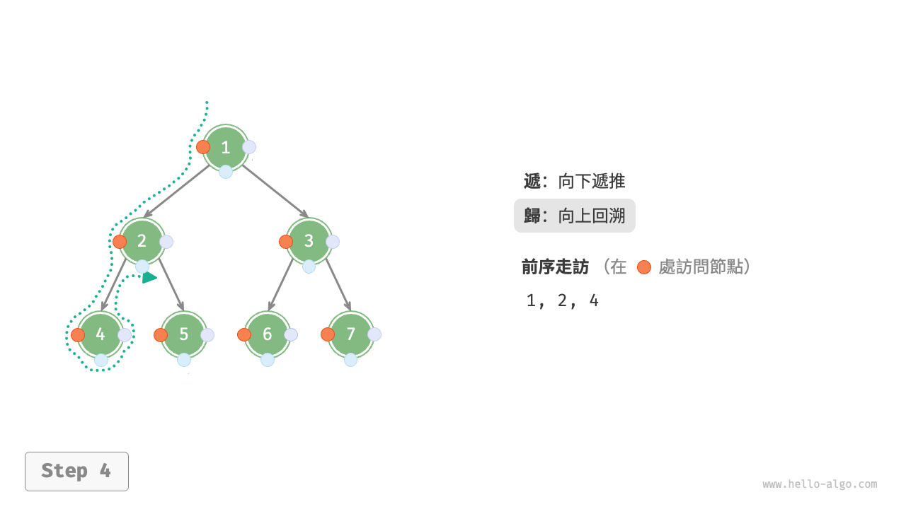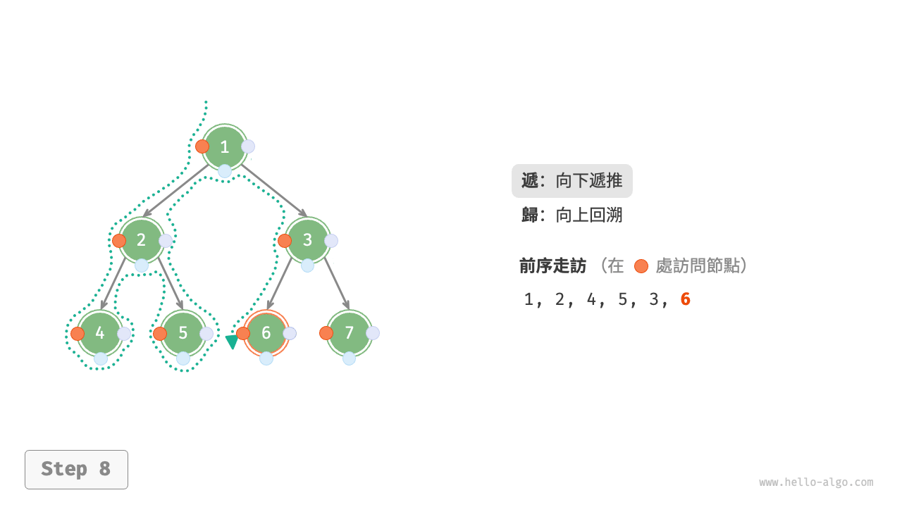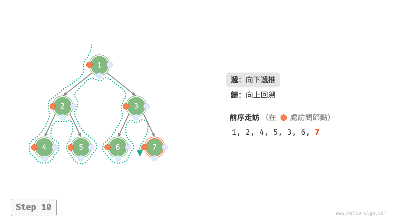 圖 7-11 展示了前序走訪二元樹的遞迴過程,其可分為“遞”和“迴”兩個逆向的部分。