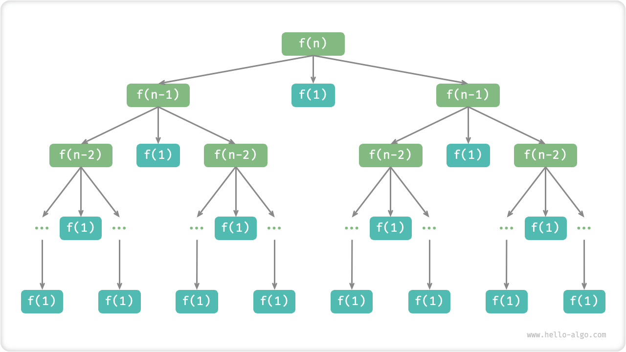 如图 12-15 所示,汉诺塔问题形成一棵高度为 \(n\) 的递归树,每个节点代表一个子问题,对应一个开启的 dfs() 函数,因此时间复杂度为 \(O(2^n)\) ,空间复杂度为 \(O(n)\) 。